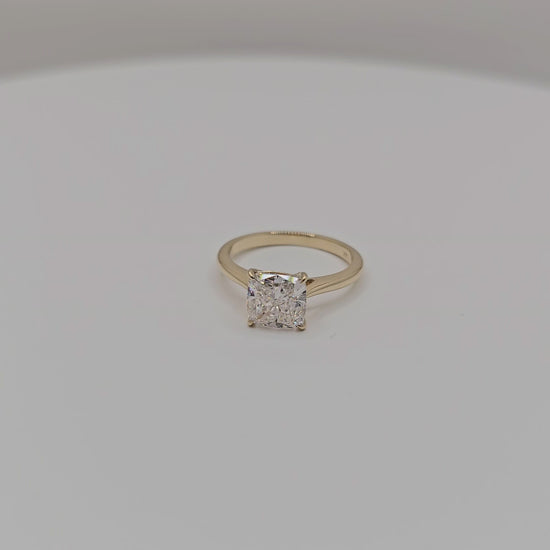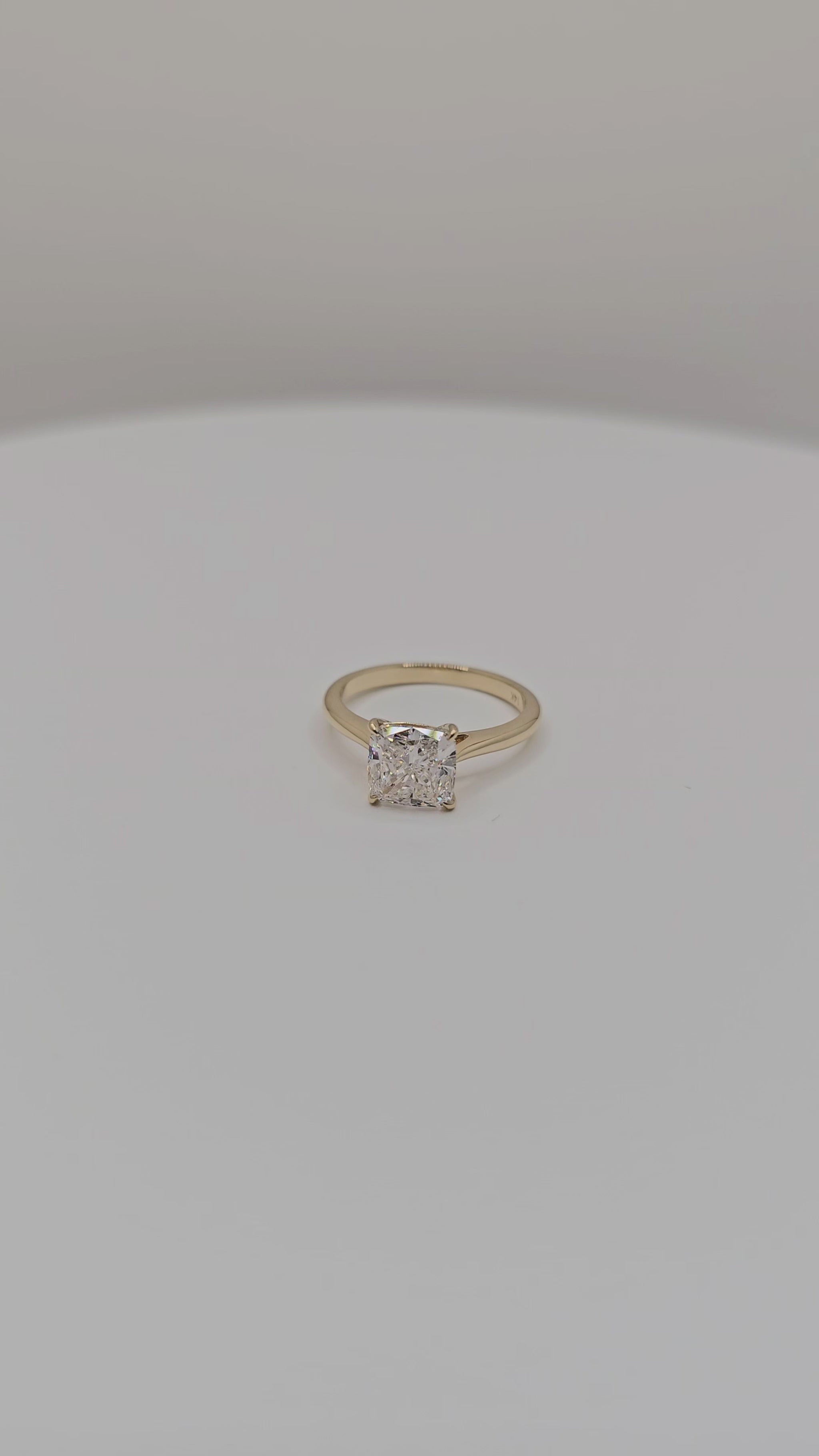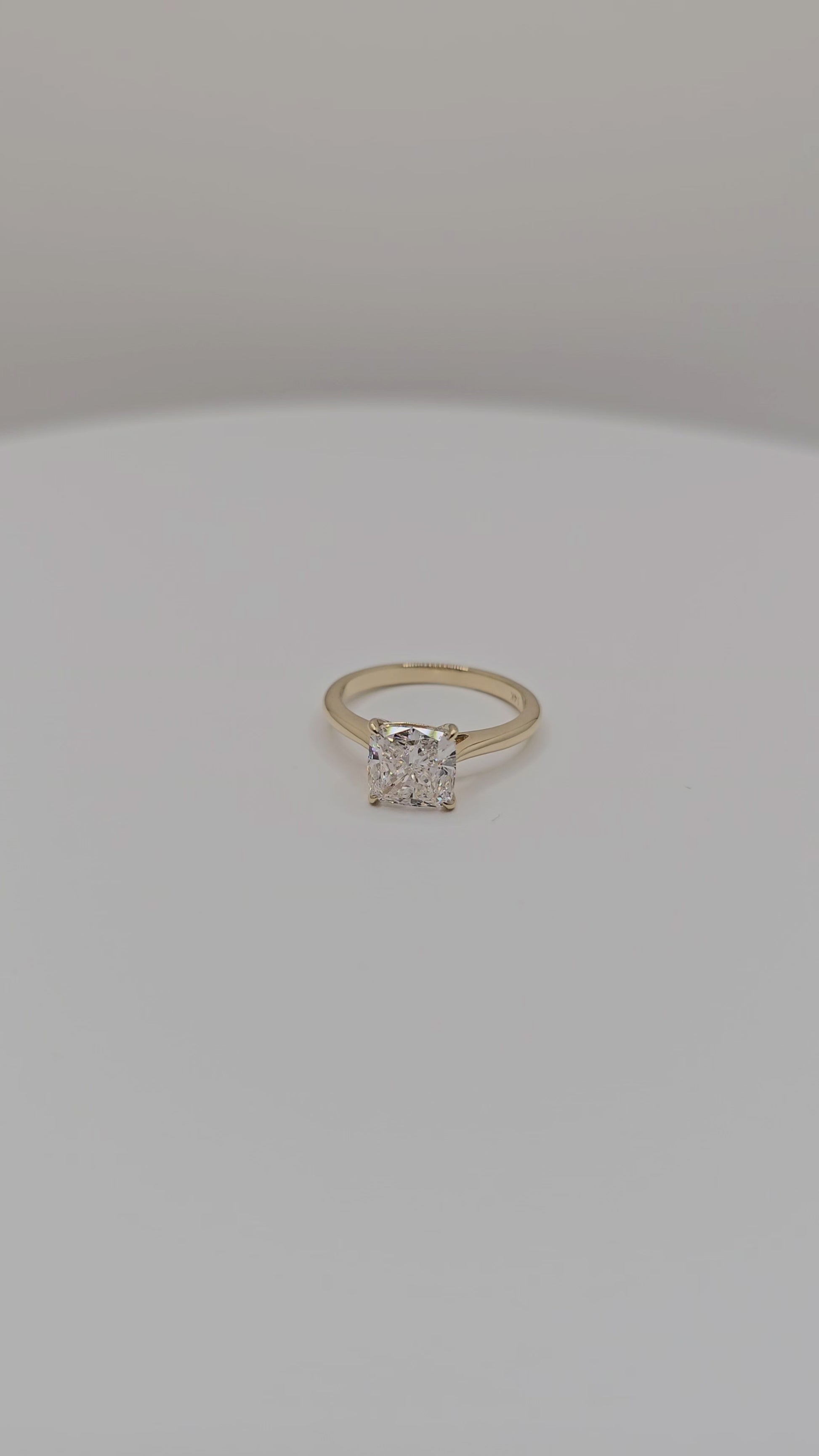 The Haven Ring features a 2.02 carat cushion-cut IGI certified lab-grown diamond solitaire set in 14k yellow gold, radiating brilliance and symbolizing devotion and commitment. Designed with a lifetime of romance in mind.